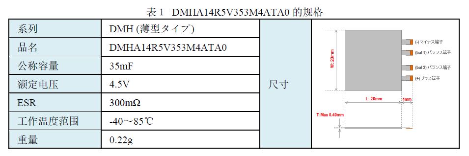 株式会社村田制作所(以下称村田)为满足此类客户的需求,特将业界超薄的T寸0.4mmMax的超级电容DMH系列商品化(图1)。改良以往超级电容生产过程中培养的电极印刷技术和研发新的叠层工艺,研发出能够最大限度确保高度方向自由度的产品。该系列的第1批产品20×20×0.4mm /35mF的超级电容将于2017年2月开始量产(参照表1)。本片文章将介绍DMH系列的适用事例和效果。