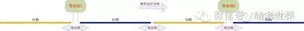 架空接触网的末端是牵引变电站,平均数十千米/座。每个变电站伸出两个供电支,提供不同相的交流电,这就是「供电段」。据此可认为铁路供电是按照「供电段」来进行划分的。图为典型「供电段」的运行模式。